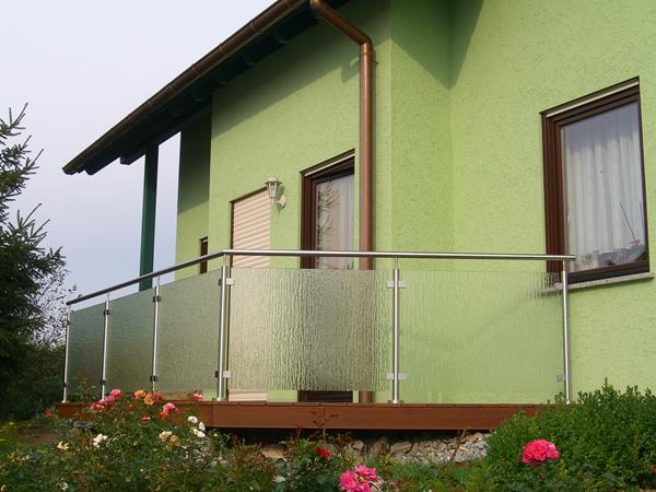 Terassendiele in Bankirai , Unterbau in Stahlkostruktion, Edelstahlbrüstungs -geländer, Ornament ESG Scheiben