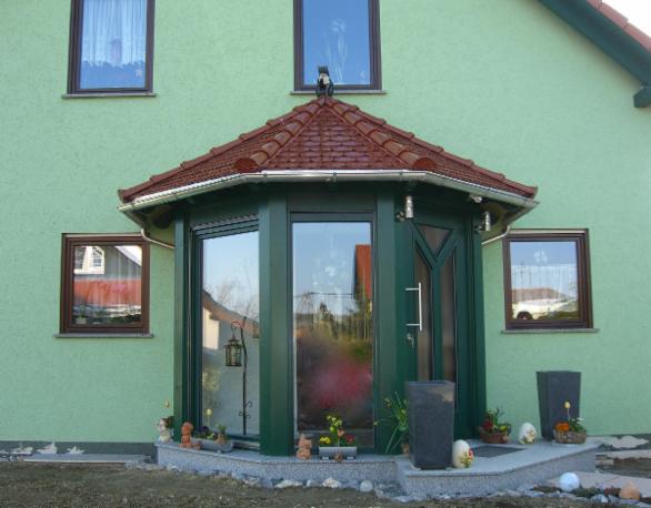 Überdachter Eingangsbereich in Balkenkonstruktion mit eingedeckten Bieberschwanz und Granitsockel - komplett aus einer Hand -