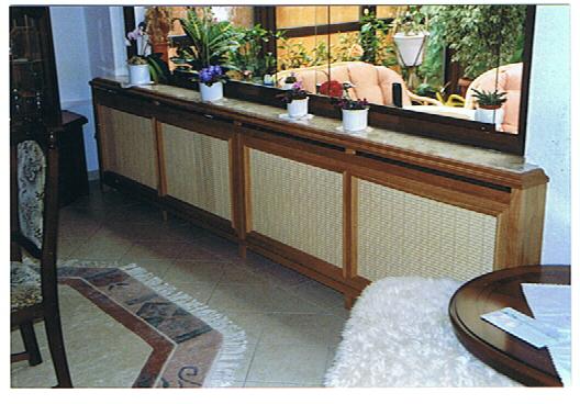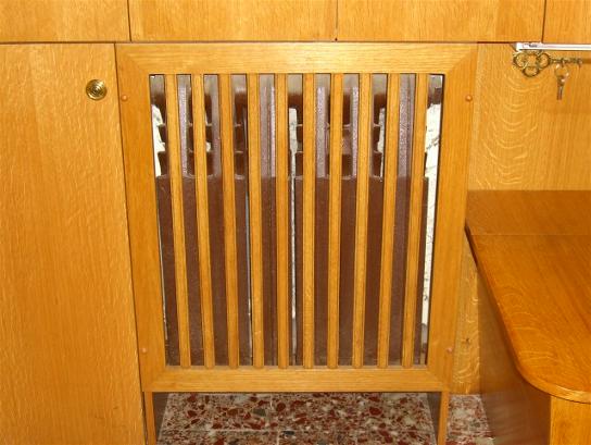 Heizkörperverkleidung mit Mamorabdeckplatte , Felder zum aushängen .